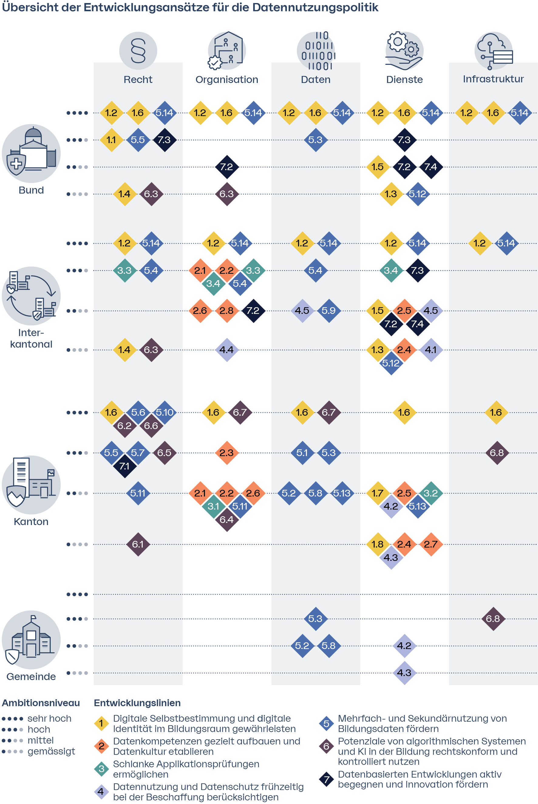 Die sieben Entwicklungslinien sind in total rund 50 konkrete Entwicklungsansätze gegliedert. Jeder dieser Ansätze ist fachlich und organisatorisch verortet, von den kommunalen Schulträgerschaften über kantonale und interkantonele Zuständigkeiten bis hin zu Bundesaufgaben. Schliesslich unterscheidet der Bericht vier Ambitionsniveaux, von «gemässigt» bis «sehr hoch».